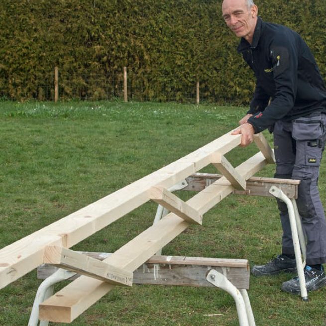 Byg de underliggende gangbrofag. De består af to lange, kraftige vanger, der holdes sammen af tværgående lægter. Lægterne monteres blot med en enkelt skrue, så gangbroen kan foldes sammen.
