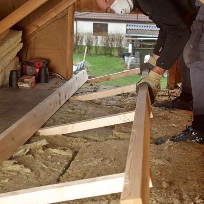 Har du allerede en gangbro, skal du starte med at forhøje den, så du kan bevæge dig rundt på loftet uden at ødelægge isoleringen. Det gøres lettest ved at isolere oven på den eksisterende gangbro med trykfaste batts. Oven på den “hårde isolering” kan du lægge et lag nye gulvplader.