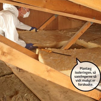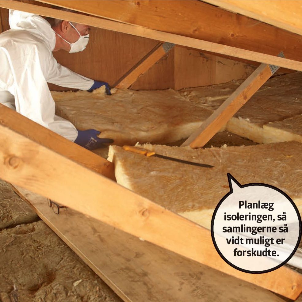 Vær omhyggelig med tilskæringen, så du får helt tætte samlinger, når isoleringen lægges på plads. Der findes særlige knive til isolering, der gør tilskæringsarbejdet lettere og resultatet bedre.