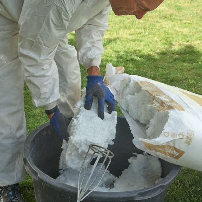 Granulat er isolering i findelte stykker. Det købes i blokke, hvor isoleringen er presset sammen. Når den findeles til små stykker, er den ideel til at “lappe” huller i eksisterende isolering eller som supplement til nye hele batts, hvis der er nogle besværlige steder, hvor det ikke lige går op.