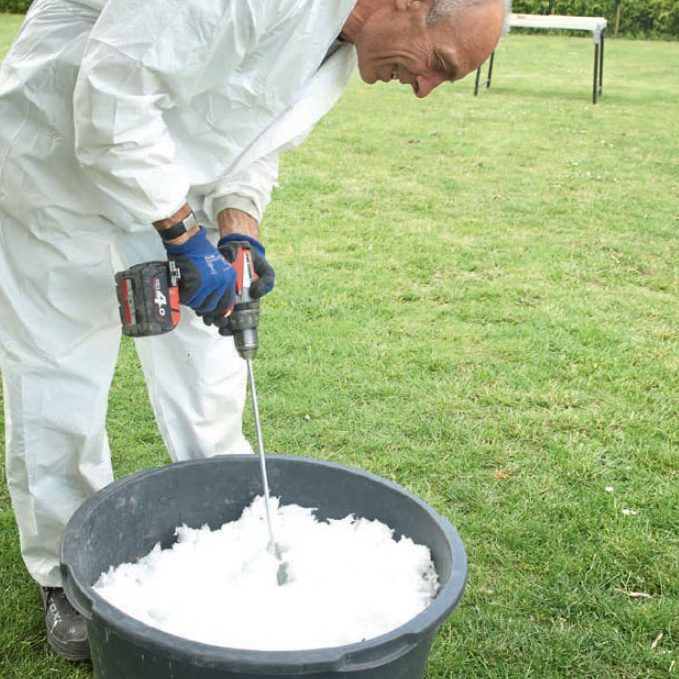 Rør rundt i baljen med et piskeris i boremaskinen, så granulatet bliver “løsnet” til små stykker, der passer ind alle steder.
