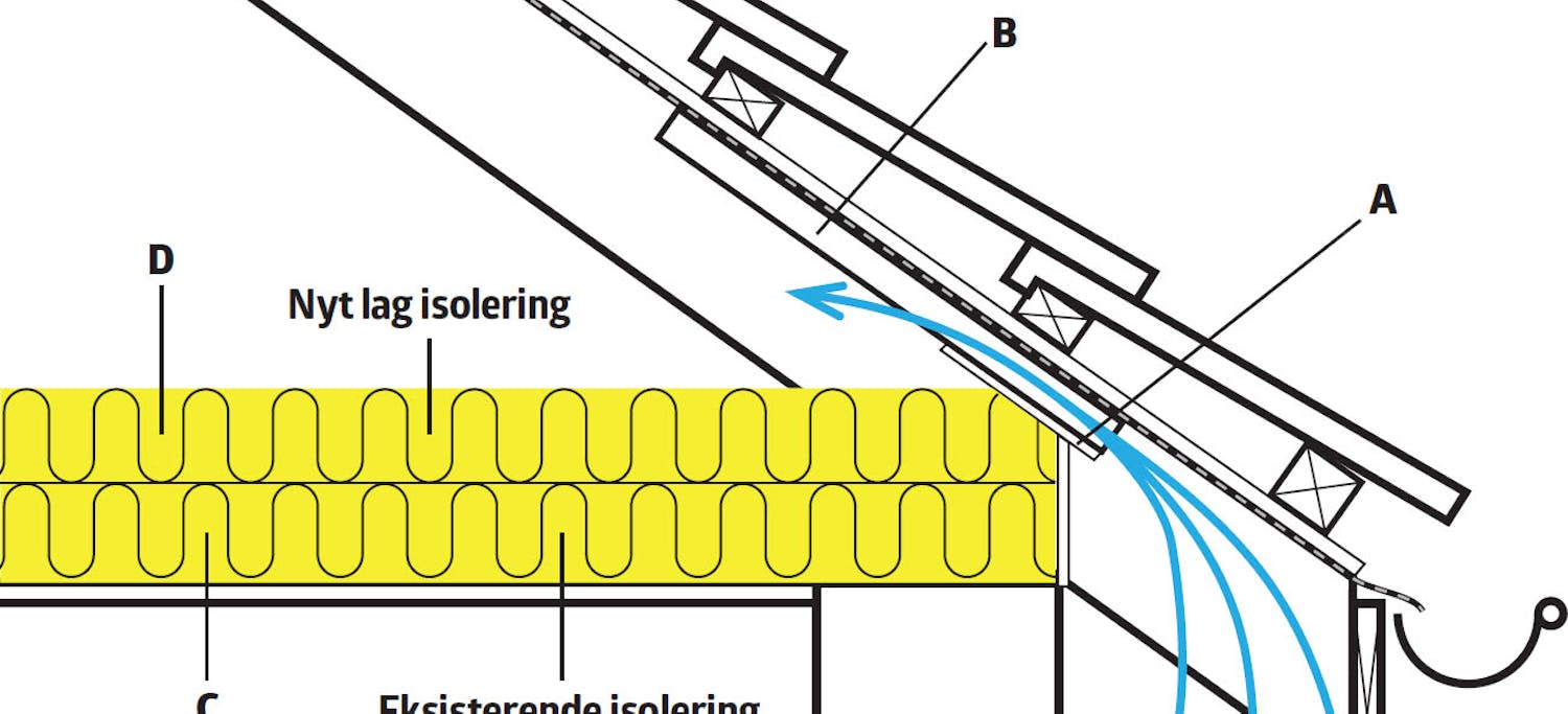 Når du lægger et tykkere lag isolering ind på loftet, er der risiko for, at du får blokeret for den ventilation, som skal holde loftsrummet tørt og sundt. Det er vigtigt, at der kommer luft op gennem udhænget, og at den kan trække uhindret op på oversiden af isoleringen. Du kan sikre en god ventilation ved hjælp af en stump masonitplade (A) og tre stykker reglar (B), der monteres til hvert spærfag og sikrer, at den forhøjede isolering (D) ikke lukker af for ventilationen.
