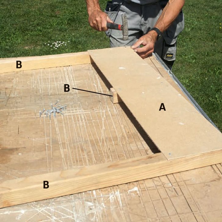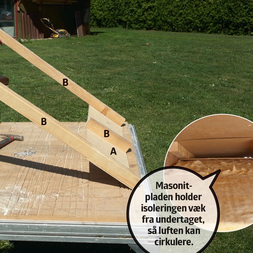 Et stykke masonitplade (A) passes til, så det passer på længden mellem spærene. Pladen sømmes fast til to lange og et kort stykke lægte (B).