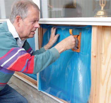 Hæft damspærrefolie på. Skær et stykke dampspærre ud, der er 10 cm større end “hulmålene”. Lad det rage 5 cm ud over karmen hele vejen rundt. Gør det fast til pladen med hæfteklammer.
