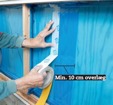 Klæb dampspærren sammen med tape, hvis den ikke kan nå. Lav et overlæg på minimum 10 cm, og tætn med dampspærretape. Brug ikke almindelig tape, det holder ikke.