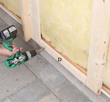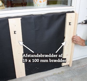 Skru lodrette afstandsbrædder (E) uden på revlerne med 4 x 40 mm skruer. I samlingen mellem to vinduesfag sættes et bræt på hver side af lodbrættet.