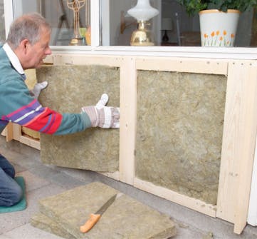 Når vi har bygget rammerne op af lister og brædder, isolerer vi.