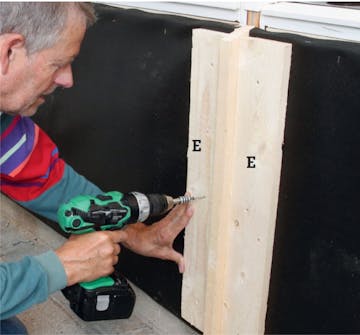 Skru en 19 x 50 mm liste (A) under karmen. Listen, der er lavet af et flækket 19 x 100 mm bræt, skal bruges til at gøre revlerne (C) fast i om lidt. Skru listerne fast med 4 x 40 mm skruer.
