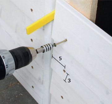 Et par dage efter kan du fortsætte med monteringen. Start med at bore 5 mm huller i klinkbrædderne, 3 cm fra underkanten og 5 cm fra enderne og ud for hvert afstandsbræt. Så er du klar til at skrue brædderne fast.