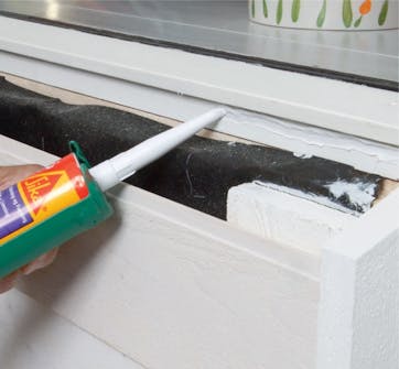 Forsegl dampspærren. Læg en pølse af fugemasse/klæber, fx Sikaflex 11 FC, hele vejen rundt på karmen inde under kanten af damspærren. Tryk dampspærren fast i fugemassen.