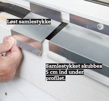 Aluprofilerne samles med 10 cm brede samlestykker, når de skal være længere end en meter. Samle stykket skubbes 5 cm ind under den sidste profil, og næste profil lægges ovenpå.