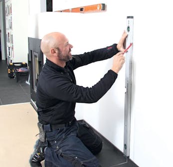 Mål ud, og tegn op på væggen, hvor brændereolen skal være. Vær flittig med vaterpasset, så du er sikker på, at det bliver lige. Vi tegner reolen op i størrelsesforholdet 1:1, så der hele tiden er streger at rette ind efter.