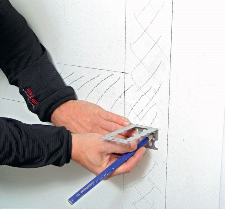 Streg op til vinkelbeslagene, som pladerne skal fastgøres til. De særlige beslag er beregnet til formålet og skal placeres i samlingerne. De har stor styrke, selv om de ikke fylder meget, og kan snildt være i limfugen mellem pladerne.