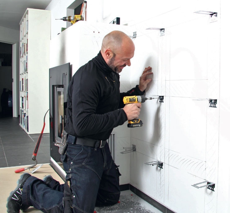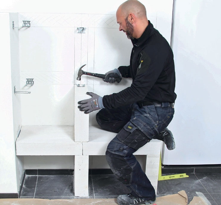 De nederste plader, der skal stå på gulvet, placeres i en cementbaseret limmørtel. De øvrige multiplader samles med en speciel lim, der smøres på med en særlig limske, så mængden bliver passende.