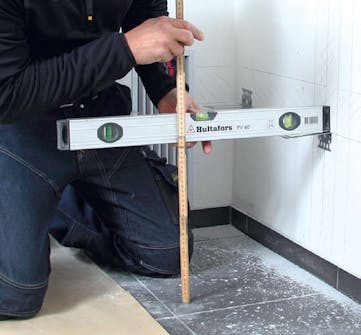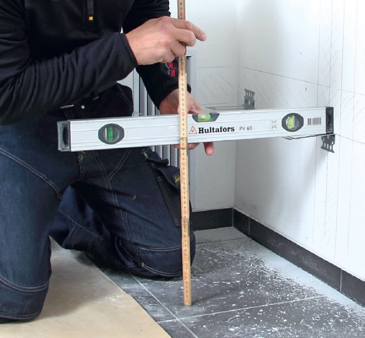 Mål op til den første plade ned mod gulvet, når vinkelbeslaget er skruet fast. Overkanten af pladen skal være vandret, mens undersiden af pladen skal følge gulvet, der sjældent er helt lige. Så mål højden både yderst og helt inde ved muren.