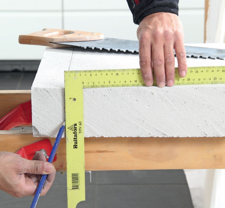 Efterhånden som pladerne saves til, stabler vi dem op og kontrollerer, at overkanterne er vandrette og siderne lodrette.