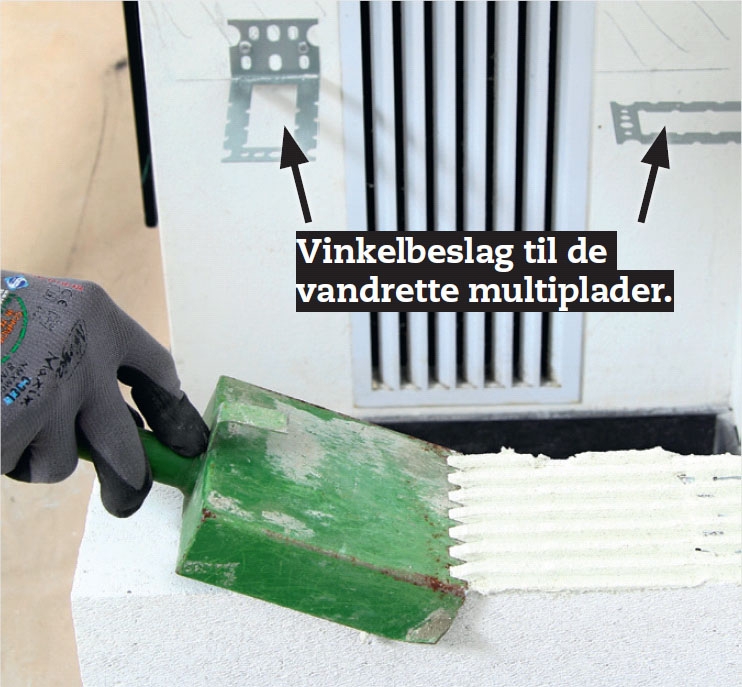 De nederste lodrette multiplader sættes op. Læg mørtlen på gulvet med en lille mureske, og sæt pladerne på plads. Skub dem forsigtigt frem og tilbage, så de står stabilt. Tjek med en vinkel, at de står præcist 90 grader ud fra muren.