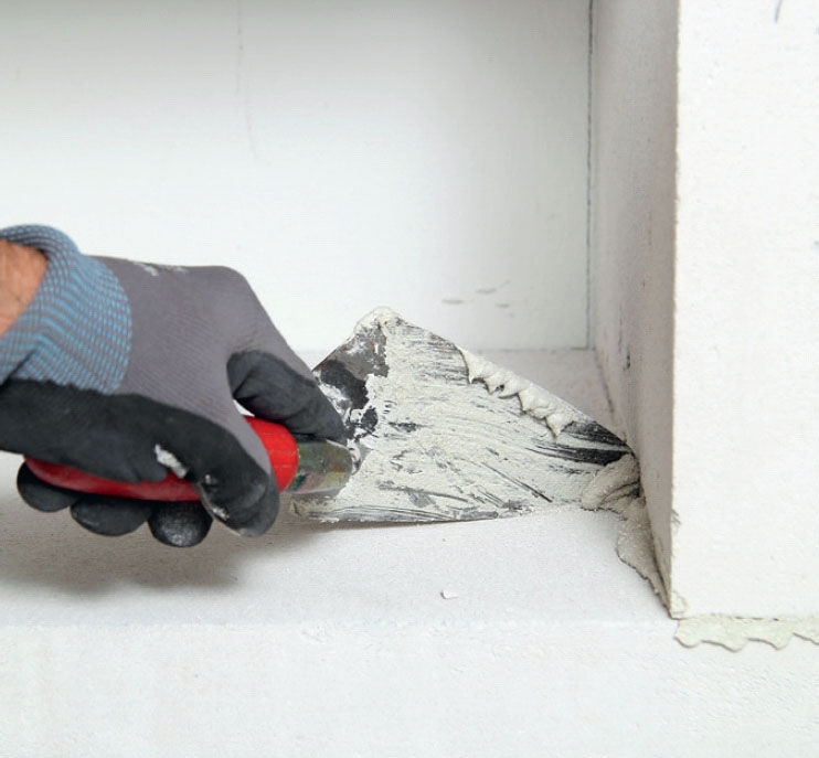 Fjern den overskydende lim. Det er en fordel at gøre det undervejs i byggeriet, inden den er tørret helt ind. Så sidder den nemlig rigtig godt fast, og skraber du i den, risikerer du at få mere slibe- og spartelarbejde.
