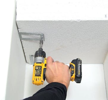 Fastgør vinkelbeslagene til muren. Vi bruger to 80 mm spunskruer til hvert beslag, efter at vi først har boret for og banket plugs i muren.