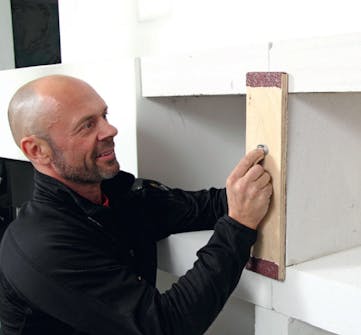 Reolen spartles færdig, når skinnerne er på plads. Træk et fint, jævnt lag på hele fladen - også hylderne. Lad så spartelmassen tørre en dags tid, inden du mellemsliber med slibepapir korn 60-80, gør rent og sandspartler anden gang.