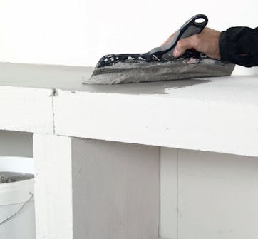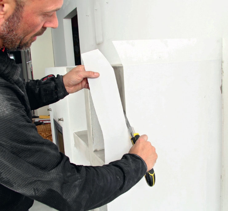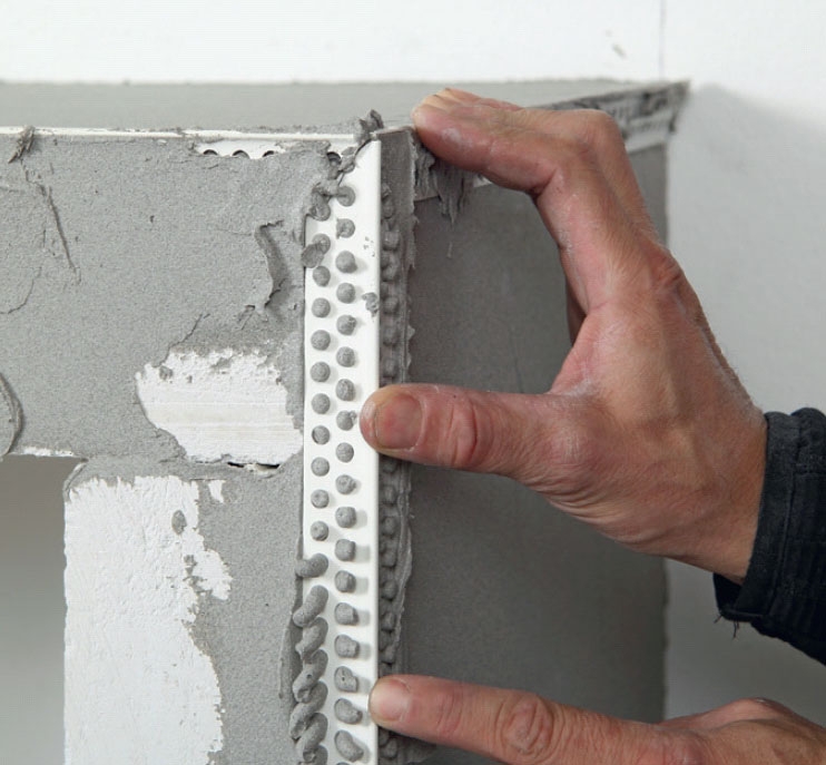 Hjørnerne beskyttes med skinner, der arbejdes godt ind i spartelmassen. Hjørner på multiplader er udsatte, så det er en god investering. Skinnerne skæres til i enderne med et skråt snit, så samlingerne bliver pæne.