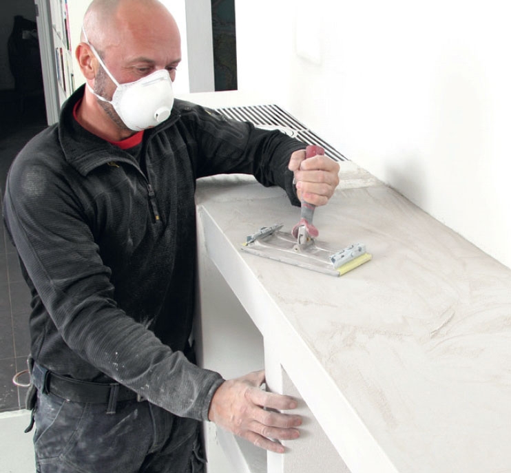 Slib reolen helt jævn og glat, når det sidste lag spartelmasse er tørt. Brug slibepapir korn 180, fx på klods. Det er vigtigt, at den er helt plan, så fladen også bliver helt jævn og ensartet. Bagefter fjernes alt slibestøvet.