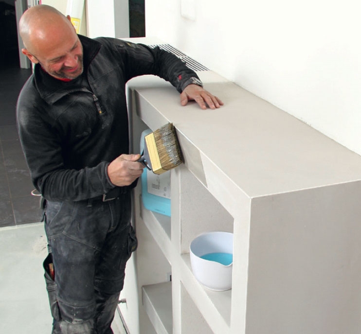 Smør forankringsgrunder på reolen. Grunderen mætter overfladen, så den klæber, vi skal bruge til at sætte filt op med, kan hæfte ordentligt.
