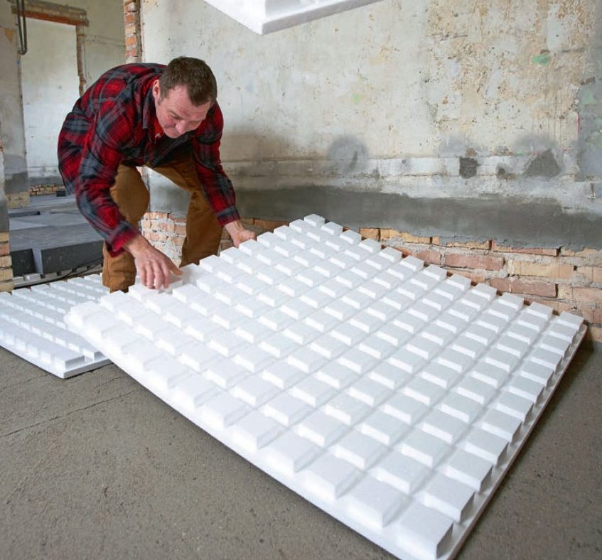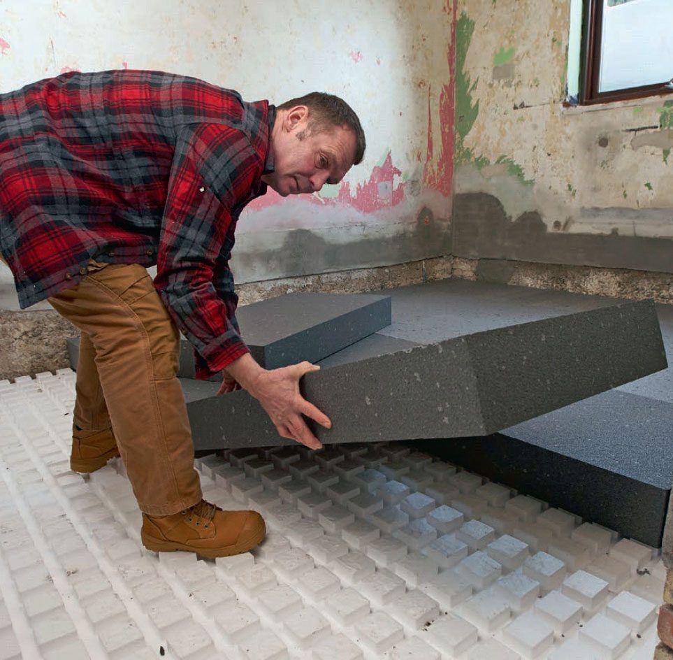 Der skal isolering under gulvvarmen. Ellers forsvinder al varmen ned i jorden. Trykfaste polystyrenplader er en nem og praktisk løsning. Polystyrenplader er normalt hvide. Når de her er grå, skyldes det, at de er tilsat grafit. Det giver ifølge producenten en øget isoleringsevne på ikke mindre end 20 procent. Du kan altså spare en femtedel af isoleringstykkelsen eller lægge samme lag og få 20 procent højere isoleringsevne.