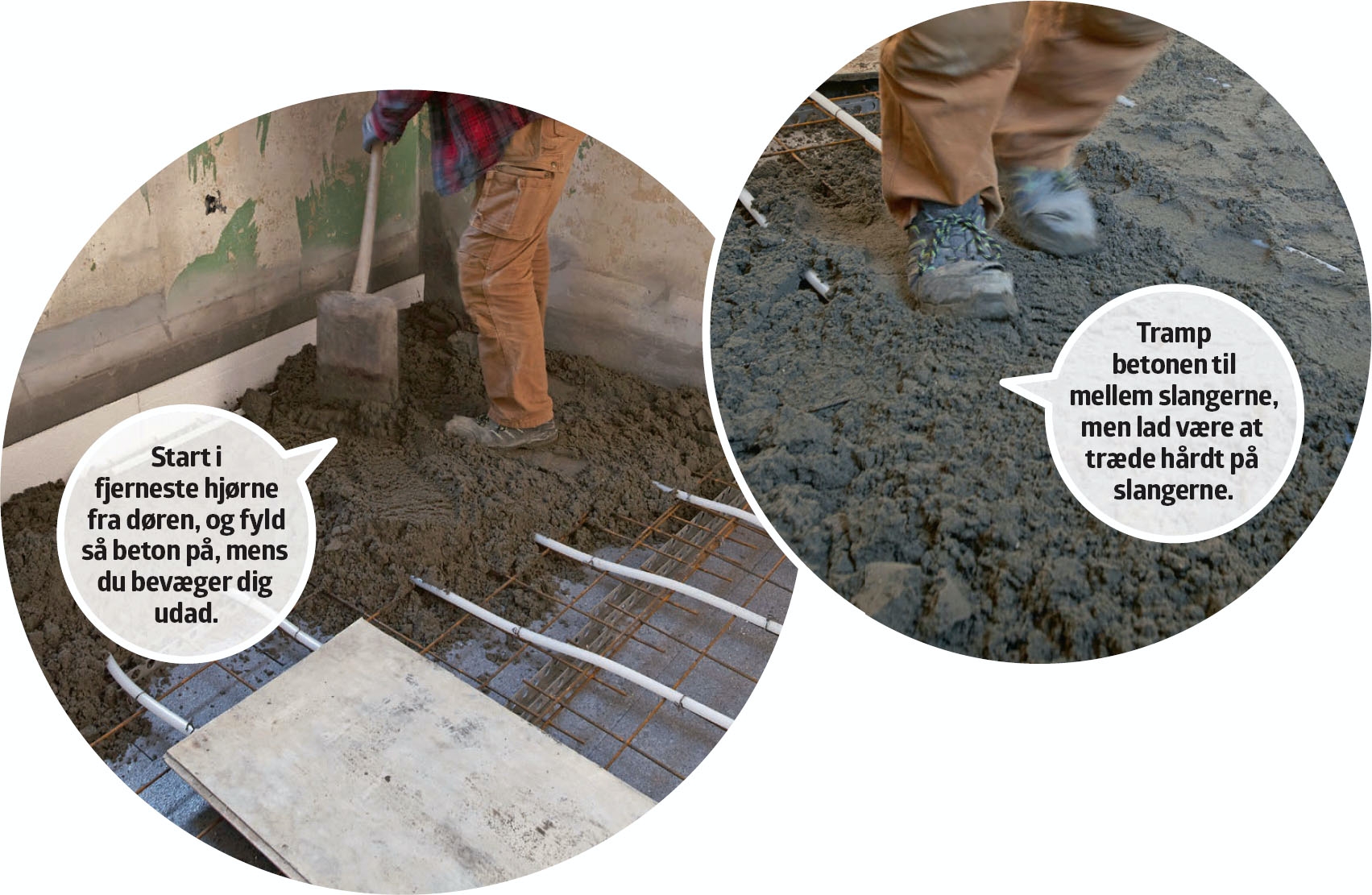 Den forholdsvis lille mængde beton kører vi simpelthen ind med trillebør. Med lidt tempo på kan det fint nås, inden betonen tørrer. Når du kører og går på gulvet, skal du beskytte gulvvarmeslangerne. De kan holde til en del, men læg en plade over, så du fordeler vægten og skåner slangerne mod at blive trykket sammen eller sparket til. Sørg for at have et målepunkt, så du kan sikre dig, at gulvet bliver vandret.