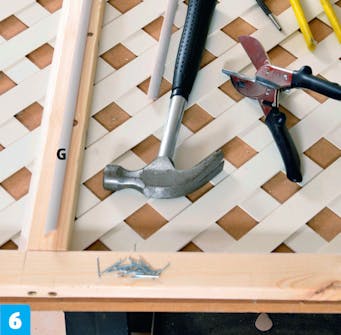 Vend rammen om, og søm kvartstaflister (G og H) fast i kanten af felterne med 1,2 x 25 mm dykkere. Listerne skæres på 45 grader i enderne, så du får en flot samling i hjørnerne.