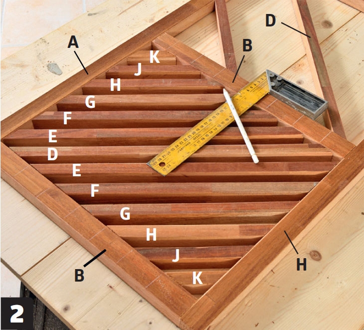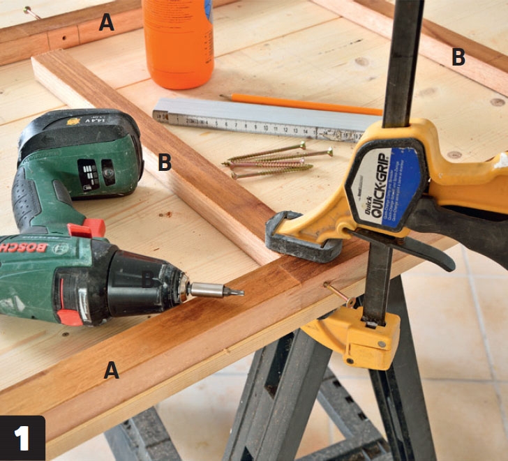 Rammen holdes fast ned mod underlaget med en tvinge. Så er det nemmere at skrue skruerne i, så listerne kommer til at ligge præcist i samme plan. Husk at bore for.