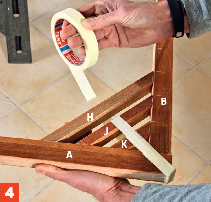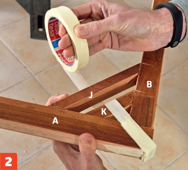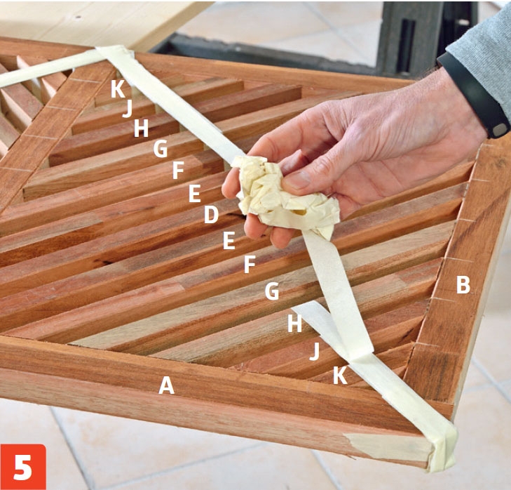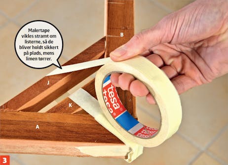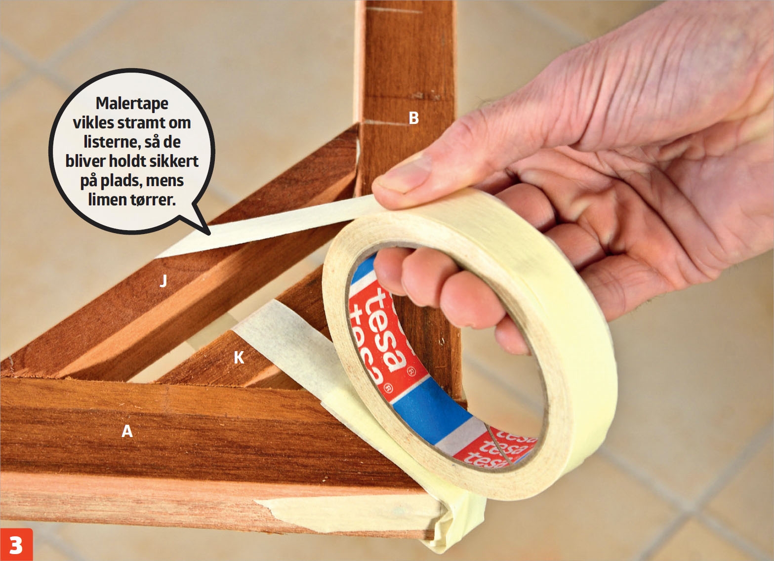 Nu skal listerne limes fast. Det kan du gøre på en smart måde med malertape, som du vikler rundt om hver enkelt liste. Så bliver de holdt på plads, mens limen tørrer.