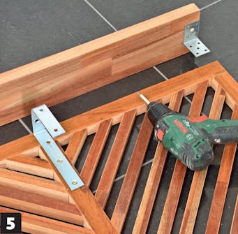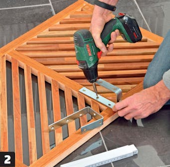Skru de to vinkelbeslag bag på skjuleren med 4 x 20 mm skruer. Beslagene skal sidde på de to næstyderste sprosser.