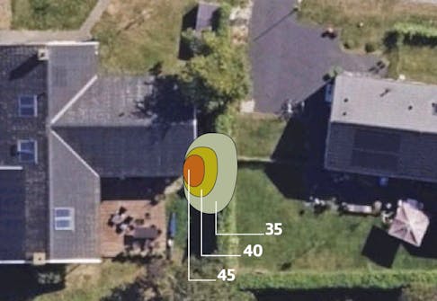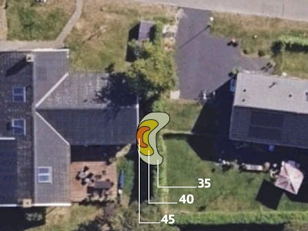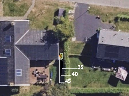 Hvis der placeres en varmepumpe, som støjer 55 dB, op ad muren på huset med det mørke tag, vil naboen få en del støj i sin have. Som udgangspunkt bør støjen, der krydser hækken, ikke overstige 35 dB – så tager du rimeligt hensyn. En varmepumpe med lavere støjniveau er naturligvis en løsning, men afskærmning kan også være en løsning.