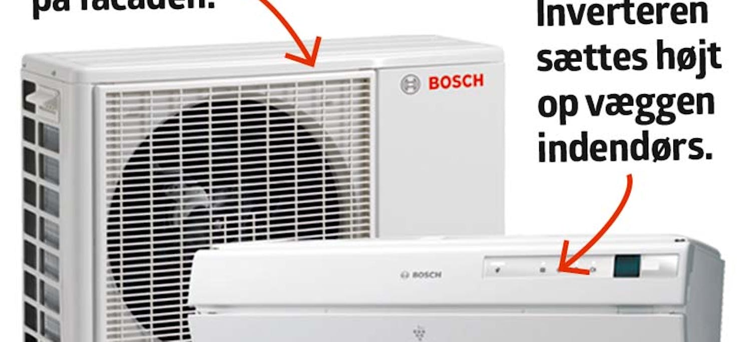 Her er valgt at hænge inverteren på rummets endevæg tæt på et hjørne. Her er der ingen, som kommer til at sidde i træk, og den sættes tæt på loftet, så varmefordelingen bliver bedst mulig. Ophængsbeslaget gøres nu fast med skruer.