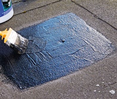 Området omkring hullet smøres med et tykt lag tagmasse. Børst grundigt mindst 15 cm på alle sider af hullet, før du pensler massen ud.