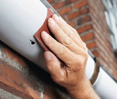 Ydersiden af den skadede rende renses grundigt. Vask snavset af, følg op med rensebenzin for at få alt fedt væk, og slib så stedet med fint slibepapir.