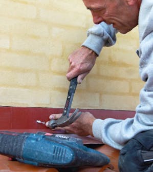 Dækprofilerne gøres fast på muren med sømplugs med det lille knæk foroven stukket ind i rillen i væggen. Hullerne til pluggen kan du med godt grej normalt bore med et multibor.