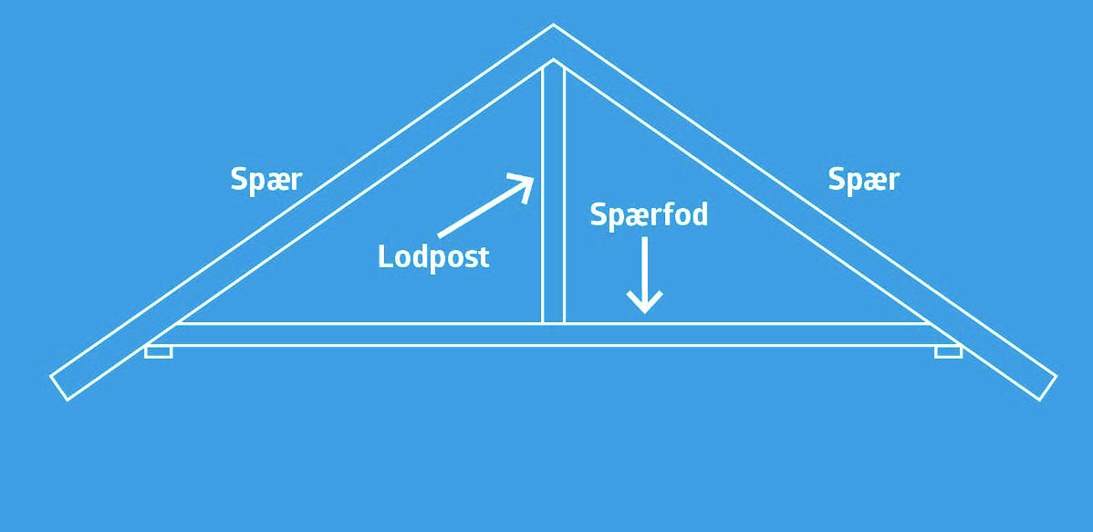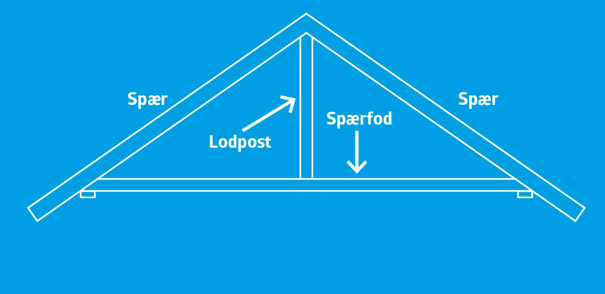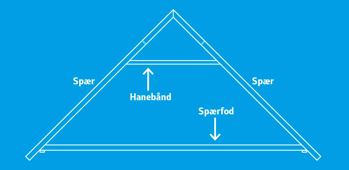 Spæret hviler på en bundrem og på en kipbjælke. Fordi der ikke er noget hanebånd, er det nemt at få en god frihøjde inde i bygningen.