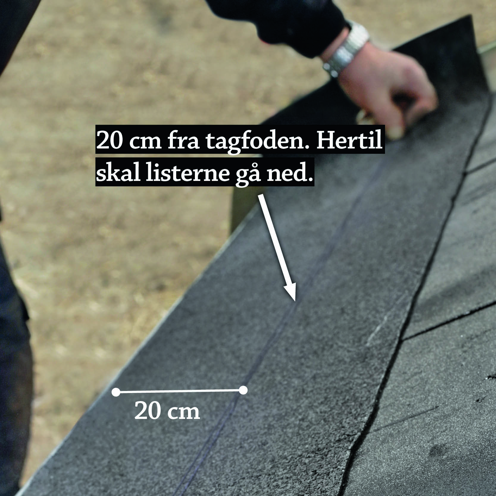 Start med at lægge en vandret bane overpap langs tagfoden. Du kan nøjes med at lægge en halv bane som her. Mærk af med kridtsnor 20 cm fra tagfoden; hertil skal listerne gå.