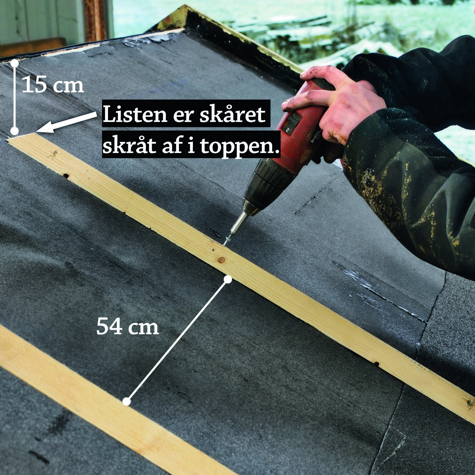 Skru listerne på. De skal gå ned over den vandrette bane, så de stopper 20 cm fra tagfoden. Foroven skal de stoppe 15 cm fra rygningen. Listernes indbyrdes afstand er 54 cm, når banen måler 60 cm.