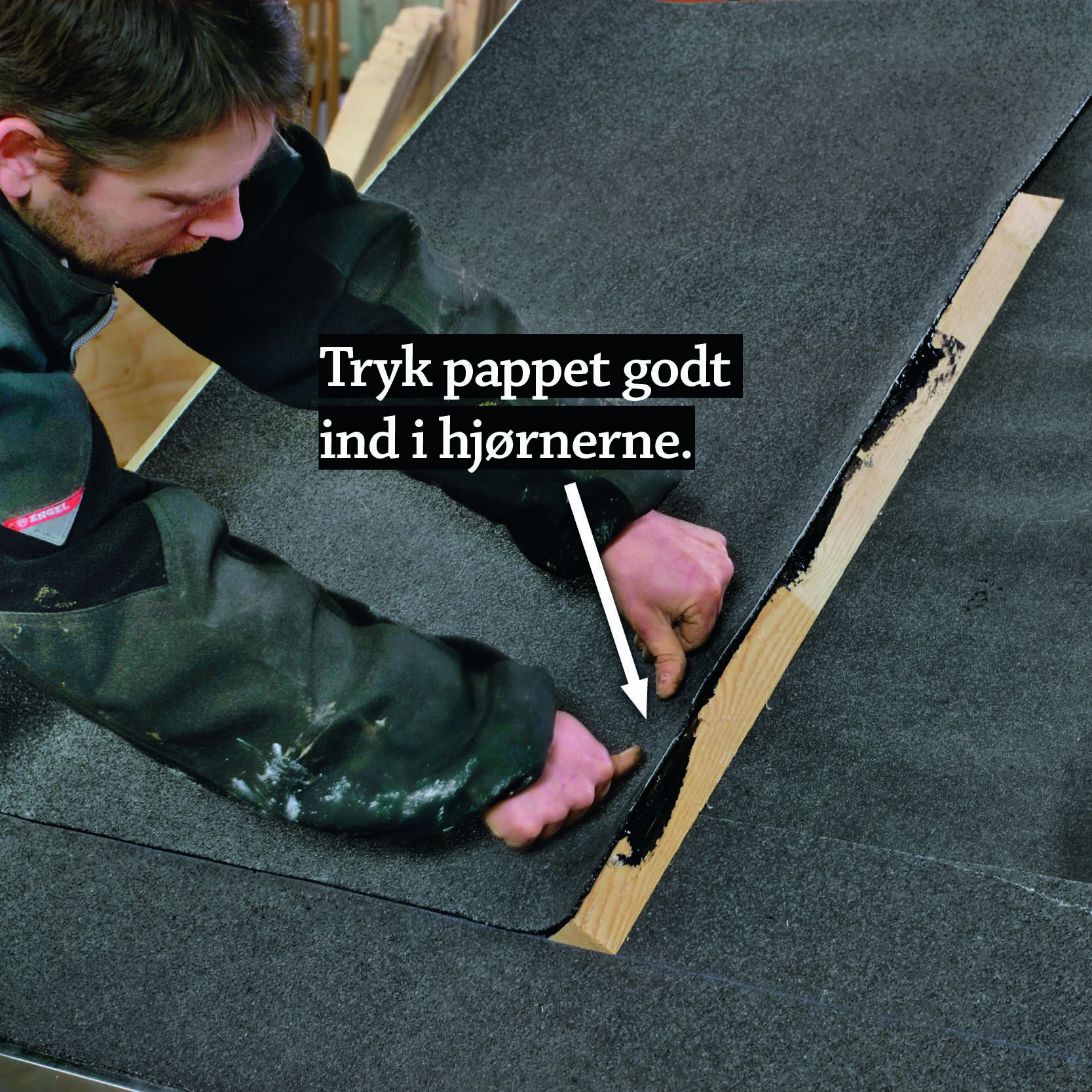 Tryk fligene godt til; her skal du igen have fat i varmepistolen, så du får gjort samlingen tæt og plan. Derved undgår du grimme buler, når den sidste strimmel pap kommer på i toppen.