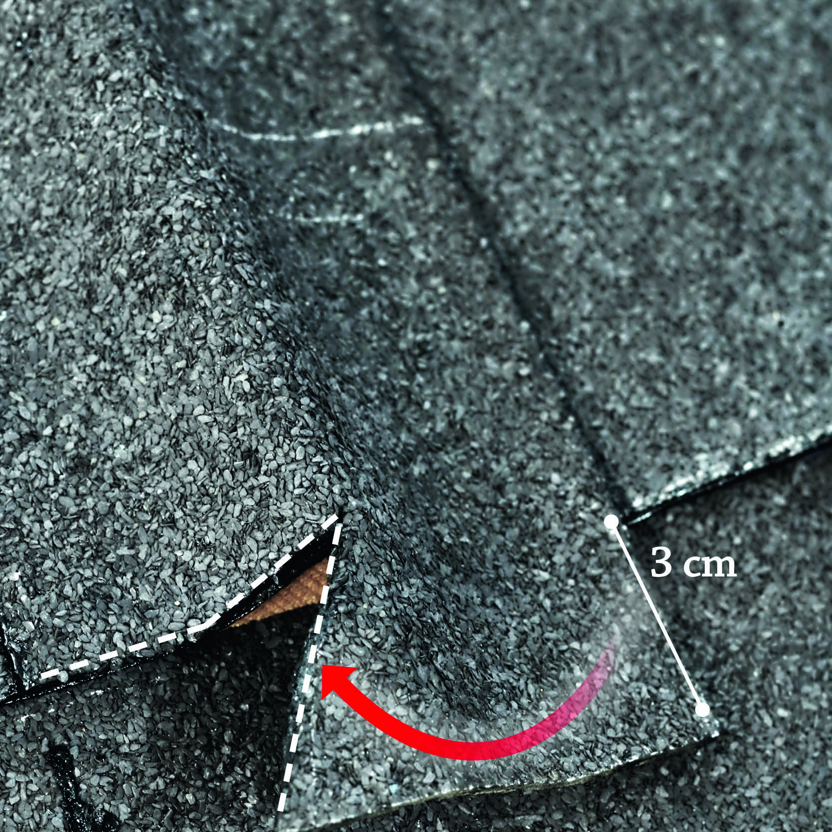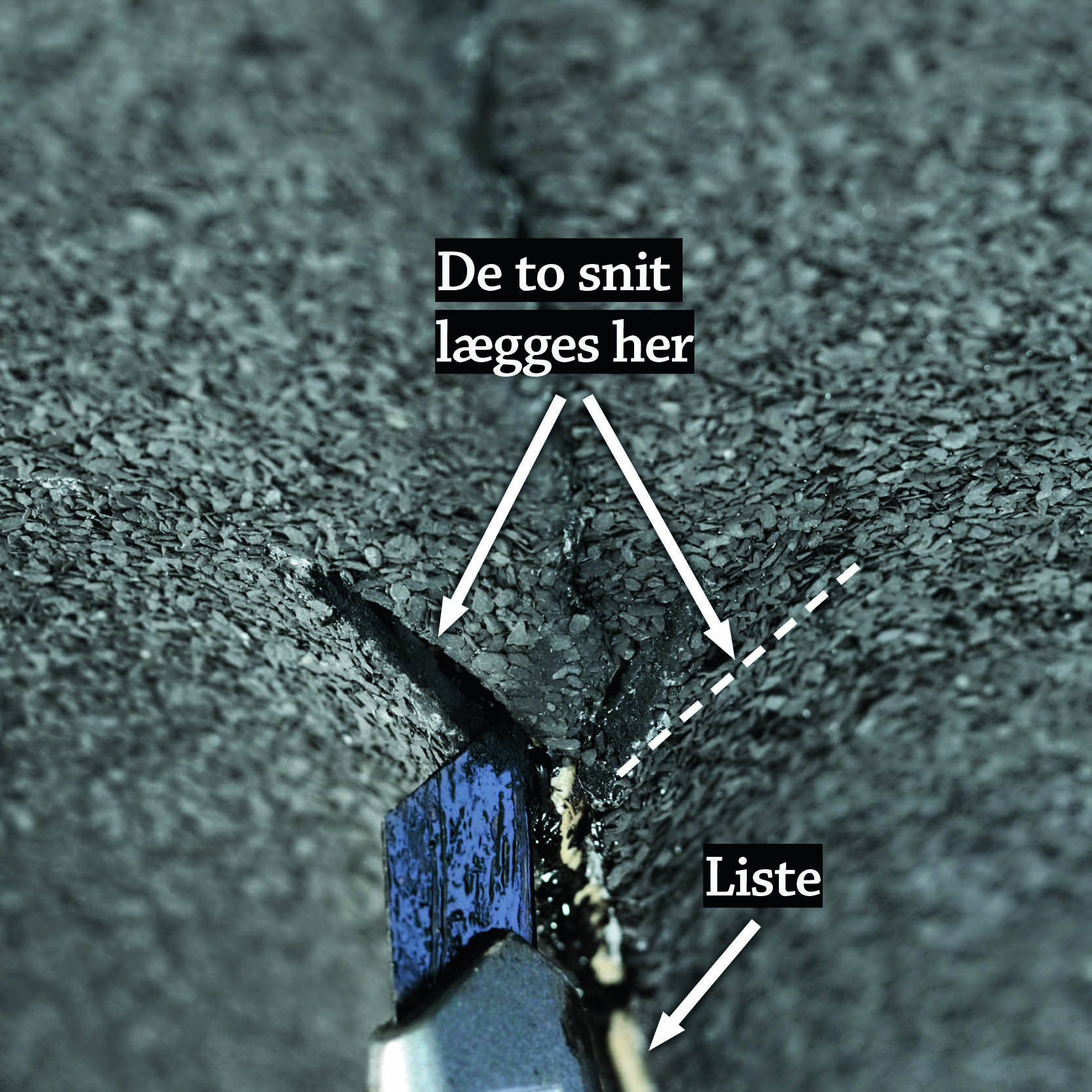 Skær først med hobbykniven oven for listen. De to baner overpap går 50 mm ud over listen og skal skæres fri øverst oppe. Det klares med to snit som vist, så banerne kan bukkes ned i plan med taget.