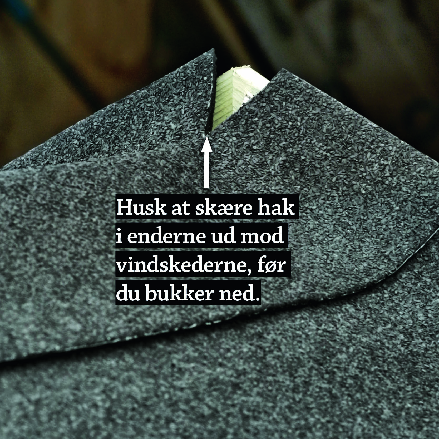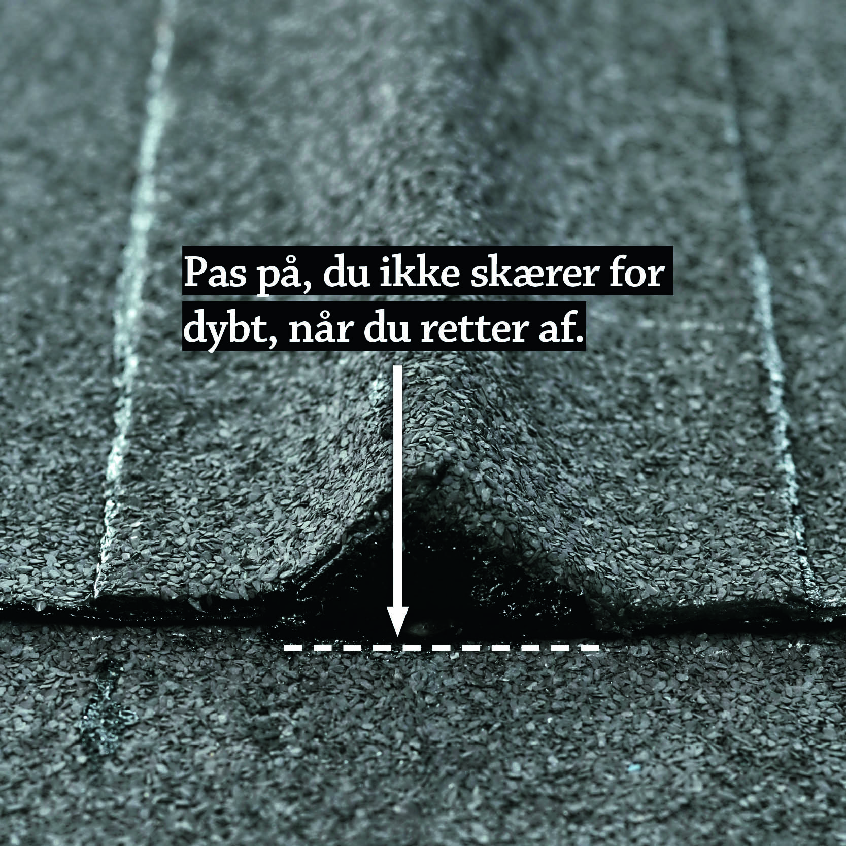 Det, som er særligt ved den, er, dels at den lige nøjagtigt når ned over listerne foroven, dels at den forsynes med hak, så pappet kan trykkes ned omkring listerne og ligge helt plant uden buler og klumpede samlinger. Det er her, du skal stå din prøve og bevise, at du kan lægge et tag lige så flot som en professionel, fordi du har fulgt Gør Det Selv’s kursus.
