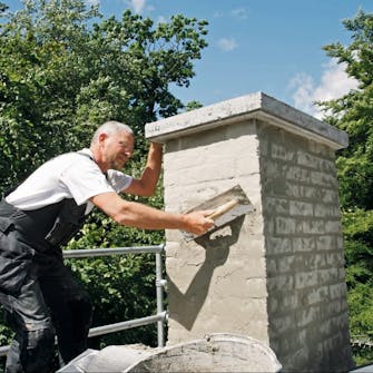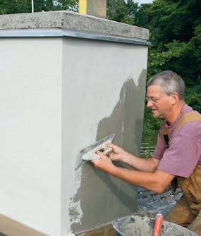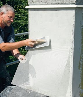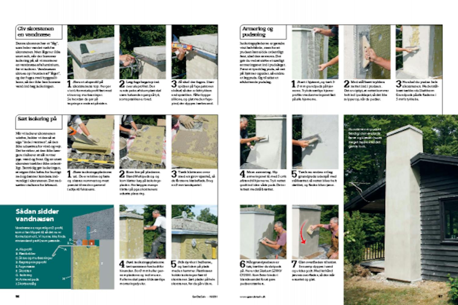 Den skorsten, vi viser her, sidder udvendigt på huset, hvorfor det er hele skorstenen, der skal pudses. Vi viser kun arbejdet med toppen af skorstenen, men du fortsætter på samme måde nedad.