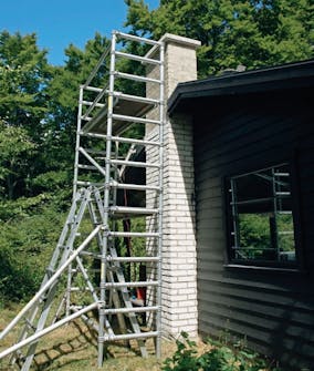Start med stilladset. For at kunne arbejde sikkert hele vejen op er det en god idé at sætte et stillads op. I hvert fald når forholdene tillader det som her, hvor skorstenen sidder uden på husets gavl.