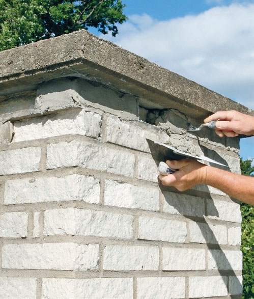 Alle løse skaller skal fjernes på denne skorsten. Herefter bliver hullerne fyldt ud med Multipuds.