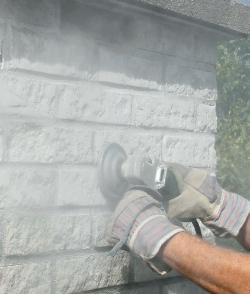 De ujævne kalksandsten slibes jævne med en diamantslibeskive på en vinkelsliber. Husk briller, støvmaske og høreværn.
