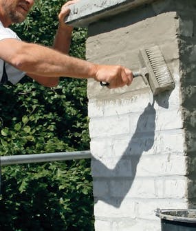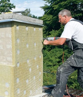 Før du isolerer, skal du fjerne gamle begroninger som alger og mos fra skorstenen med algefjerner eller sokkelrens. Evt. huller fyldes ud med Multipuds, og buler slibes af, så der ikke er ujævnheder, der er større end 5 mm.