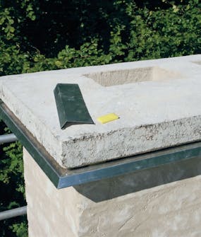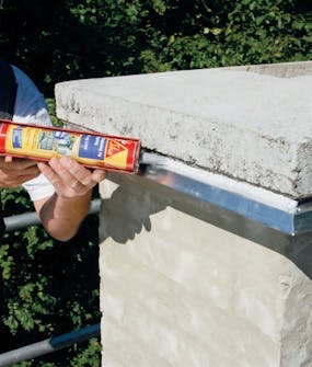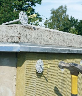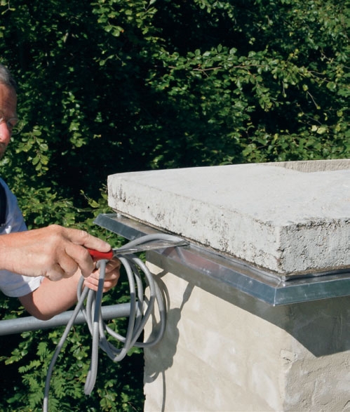 Skru et aluprofil på skorstenens top. Her gør vi et L-formet aluprofil fast med skruer og murbøsninger. Se hvordan du gør på tegningen nederst på siden.